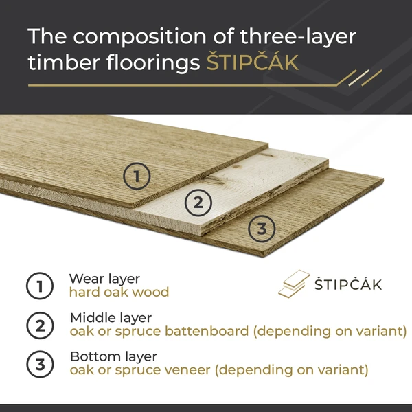 Our timber floorings always consist of three layers and the type of timber used for each layer changes depending on which product line it is.